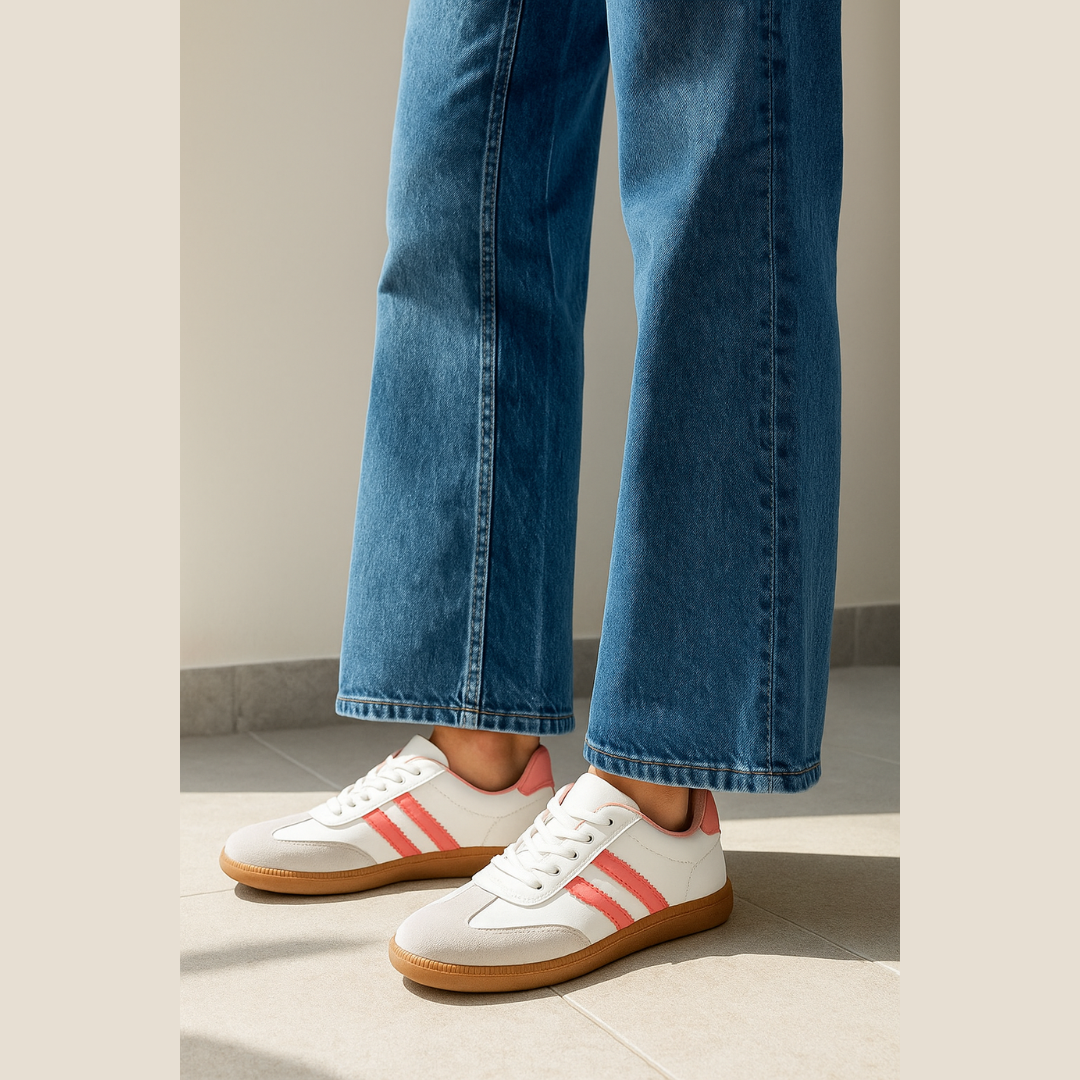 Zapatillas estilo Samba para mujer, con franjas rosadas que le dan un look femenino y a la moda. ¡Perfectas para cualquier ocasión!